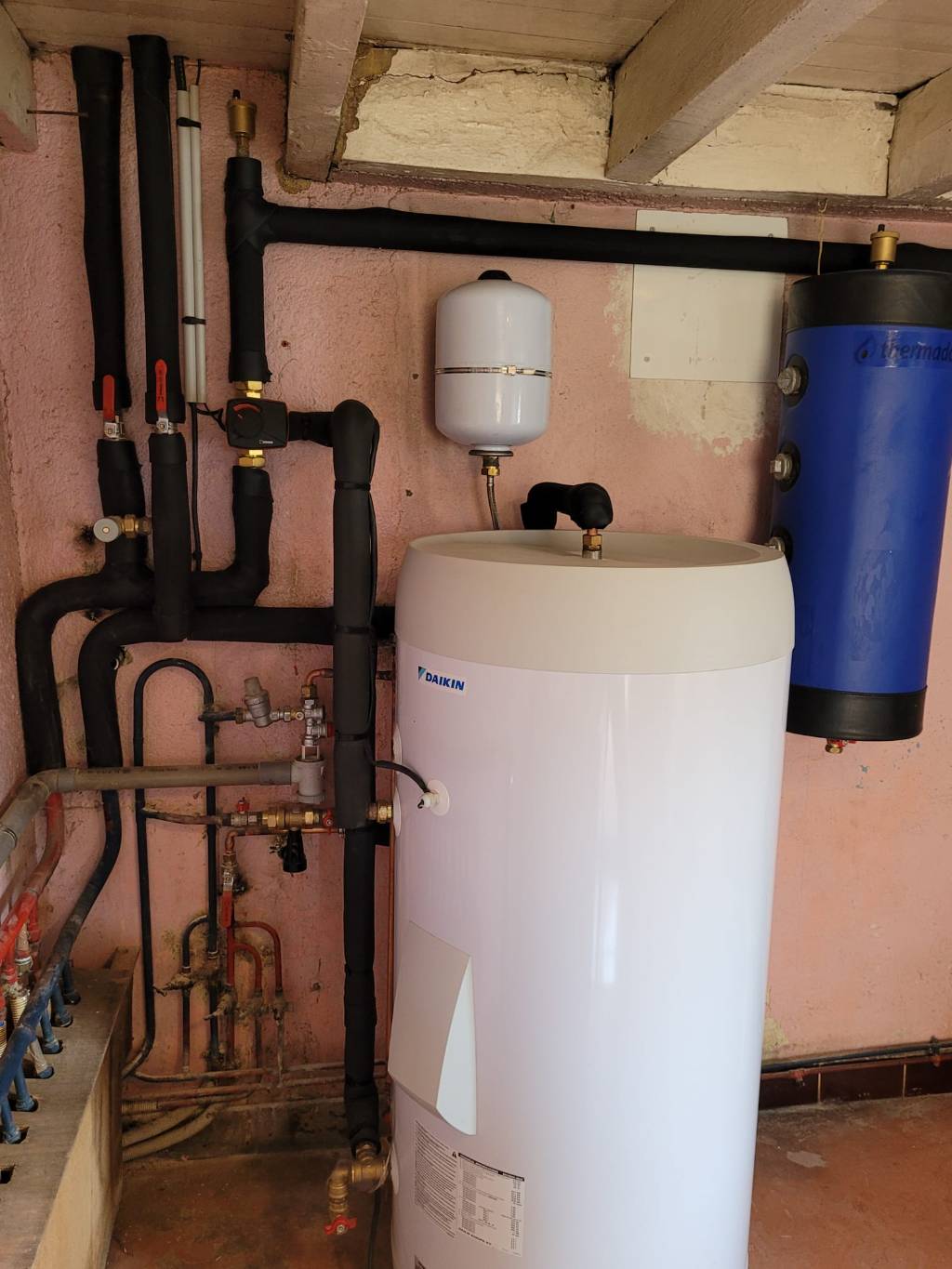 En sortie de la PAC, mise en place d'un ballon tampon mural de 25 litres qui permet d'allonger la durée de vie du compresseur.